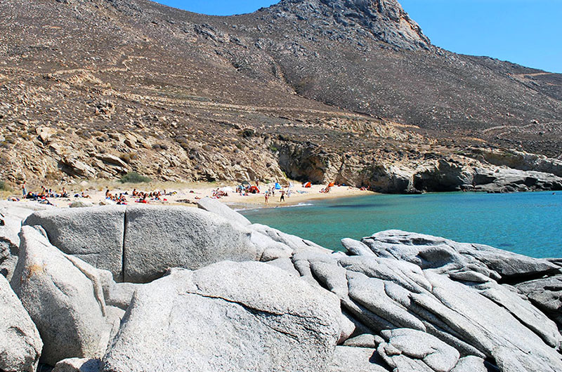Στο δρόμο που οδηγεί προς τον Άγιο Σώστη, στρίβεται λίγο νωρίτερα στην ταμπέλα προς παραλία και μετά από ένα σύντομο χωματόδρομο αφήνεται το όχημά σας. Από εδώ ακολουθείτε το μονοπάτι και σε 10’ περίπου φτάνετε στην παραλία. Είναι πραγματικά μία πανέμορφη παραλία σε ένα άγριο τοπίο με βράχια αλλά πανέμορφα νερά. Απέναντί της βρίσκεται το νησάκι του Βου.Καλό είναι να είστε εφοδιασμένοι με νερό και κάποιο σνακ, ενώ αν θέλετε να κάτσετε όλη τη μέρα φροντίστε για σκιά καθώς στην παραλία δεν υπάρχουν δέντρα.