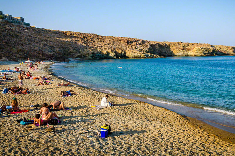 Ένας βατός χωματόδρομος (περίπου 4χλμ) οδηγεί στη μεγάλη βοτσαλωτή παραλία στη δυτική πλευρά του νησιού, όπου αξίζει να κάτσετε μέχρι το απόγευμα για να απολαύσετε το ηλιοβασίλεμα. Στην περιοχή θα δείτε απομεινάρια των εκκαμινεύσεων. Βότσαλα κυριαρχούν σε όλη την παραλία ενώ υπάρχουν και πολύ λίγα δέντρα για σκιά.